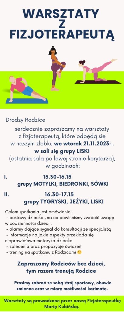 zapraszamy na warsztaty z fizjoterapeutą, które odbędą się w naszym żłobku we wtorek 21.11.2023r, w sali się grupy LISKI, w godzinach: